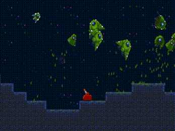 You control the red tank and must avoid the acid raining from the green spaceships.